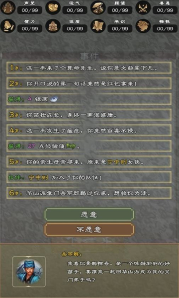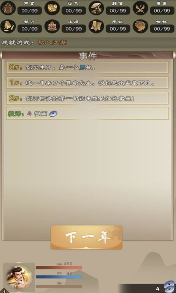 3、正式开始游戏,点击下一年就可以开始游戏进程;剧情会随机出现事件