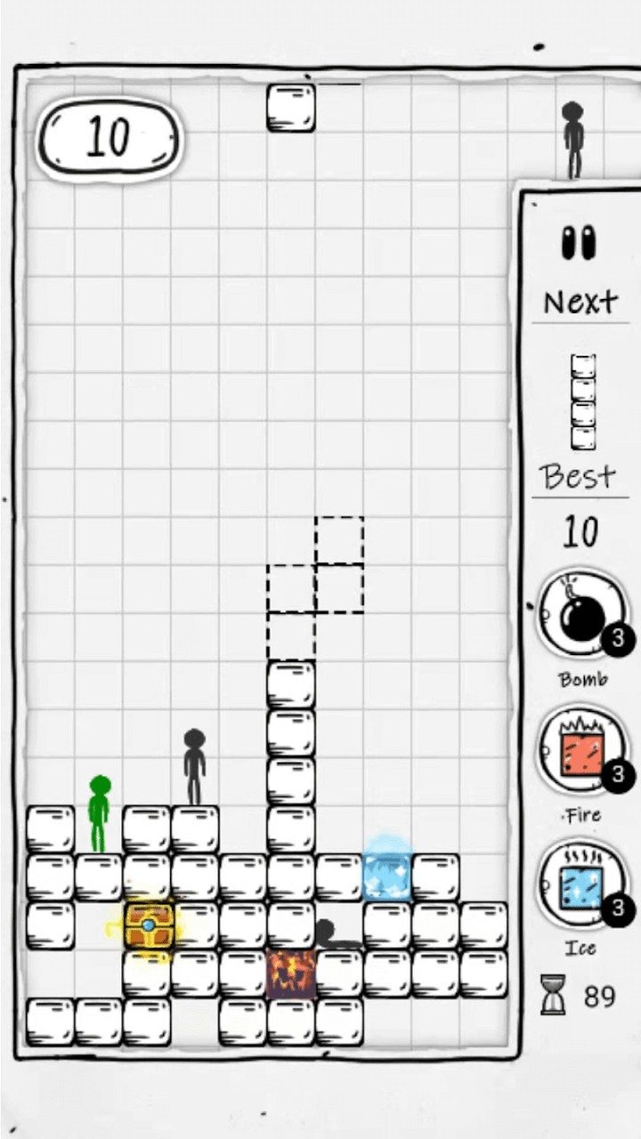 这是一款可爱画风的游戏,用的是人们耳熟能详的火柴人来当主角,然而再结合俄罗斯方块的玩法让人耳目一新。