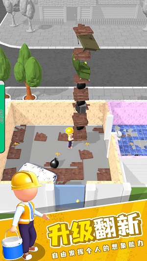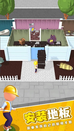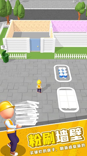 使用不同的工具进行改造和装扮,让眼前的空地慢慢的建成一座房子来进行售卖,获得大量的奖励和顾客去提升自己的知名度,来提高自己的效率和升级。