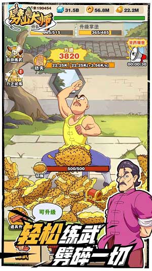 劈山大师是一款非常魔性的模拟经营类放置游戏,玩家在其中能够不但的练武,通过劈开不同的物品来帮助你提升功夫的级别,还有各种熟练度都将展现在你的眼前,经营你的武馆,游戏中还有很多的试炼可以去参加,非常好玩。