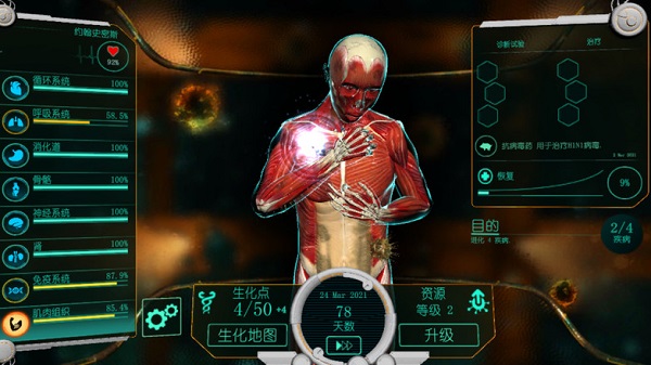 2、玩家在其中将会面临人体系统的研究,需要研究出各种抵抗病毒的疫苗,拯救世界;