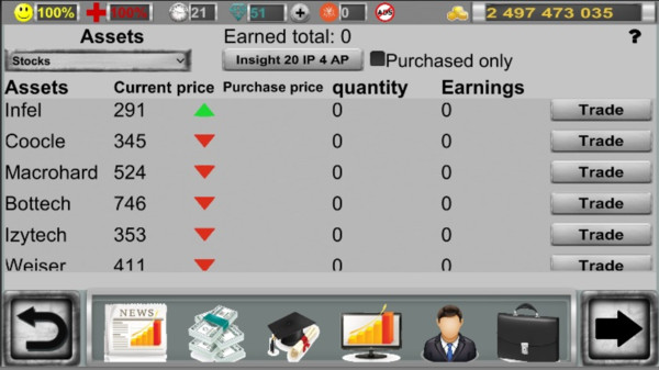 投资模拟器3是一款投资经营模拟类的游戏,玩家可以在游戏中模拟投资,来进行各种各样的选择,感受机会与风险并存,参与游戏当中的各类投资赚取丰厚的收益,当然,在其中要掌握规律,才能准确的投资在具有潜力的目标之上,从而为你获取最大收益。