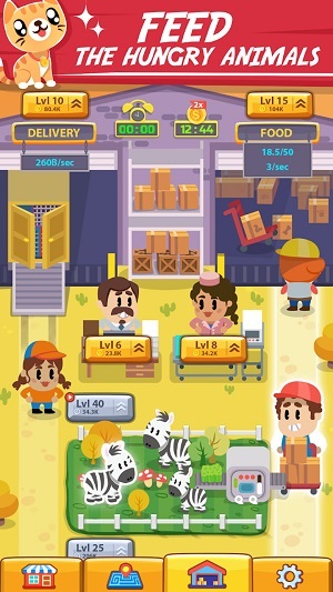 喂养饥饿的动物,在超级おもしろい喂养动物模拟器中升级工人,加快交货和分发食物,在这个动物健康闲散的工厂;