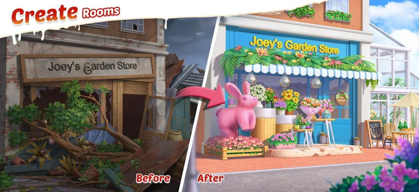 2、展示您的花园和家居装修技巧,只需安装安娜的花园三消益智游戏并跟随爱情故事。
