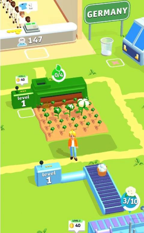 1、随意滑动屏幕获得启动资金,然后在指定位置种植棉花和建造服装加工设备。