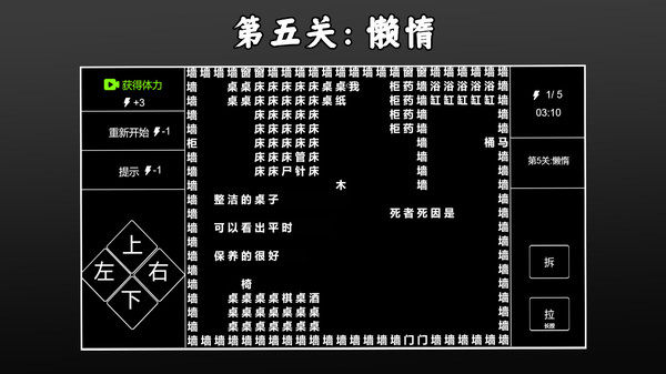 2.使用箭头键控制单词我字移动,使用“拆”和“拉”破译文本并处理各种情况。