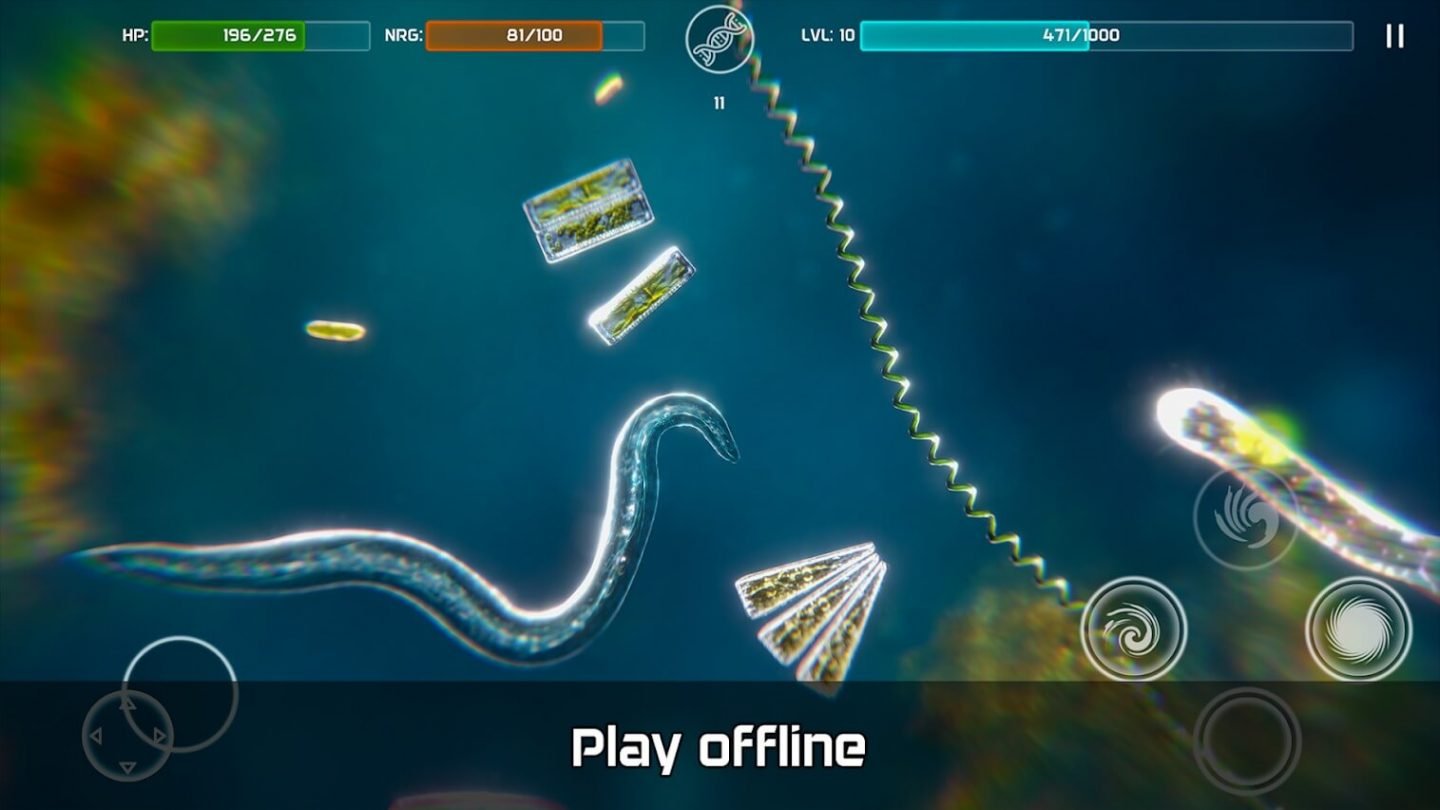 游戏是显微镜的显示。角色不说话,也不打架,而是会不断出现接近、探查、吃细胞和细菌、收集DNA、不断进化成不同形状的场景。