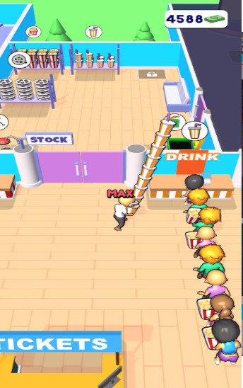 2、在电影院中玩家还可以扩展更多的业务,比如买一些爆米花和一些可乐和汉堡之类的,赚取收益;