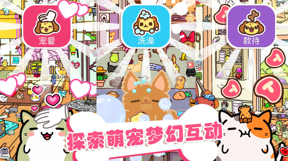 在这款游戏中玩家你可以和不同宠物去互动的,而且不断地互动中玩家你可以体验一些新的趣味玩法,每一种都是非常的甜蜜。