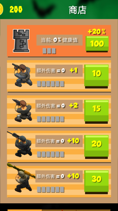 1、可以购买不同的道具来进行闯关,完成攻击丧尸的任务,很过瘾