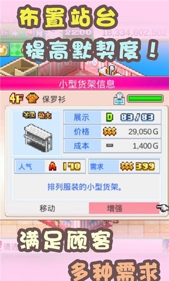 这作为一款由开罗公司研发制作的又一款模拟模拟经营游戏力作,熟悉的画风,经典的内容布局,本作中用户将经营一家洋品店,从衣服的摆放到制定各种营销策略,为了打开销路,所有的事情都需要用户亲力亲为,互动性与手游性极强,是用户不可错过的一款精品模拟手游。