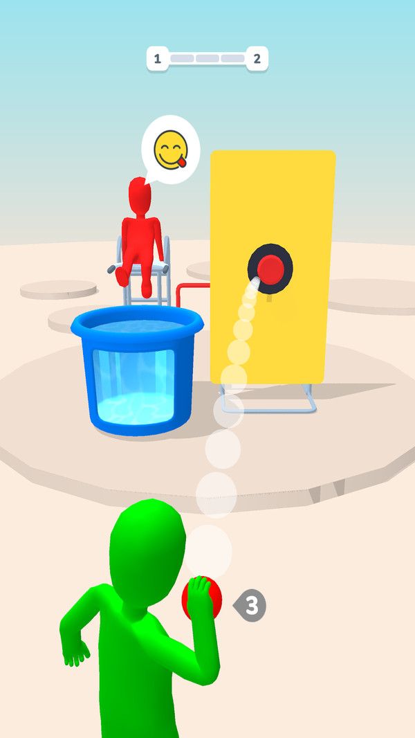 有一个非常有趣的机制,一个小人坐在凳子上,它的下方是一缸水,而在它的旁边的水箱上有一个红色的按钮,玩家则需要操作另外一个小人,通过投掷小球来砸中红色的按钮,一旦砸中,那么凳子上的机关就会触发,将凳子上的小人推到水中去。非常魔性而又恶搞的小游戏,有着非常真实的游戏画面和三维建模打造。