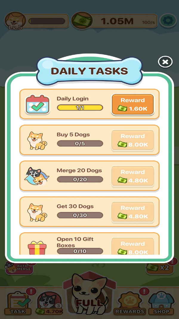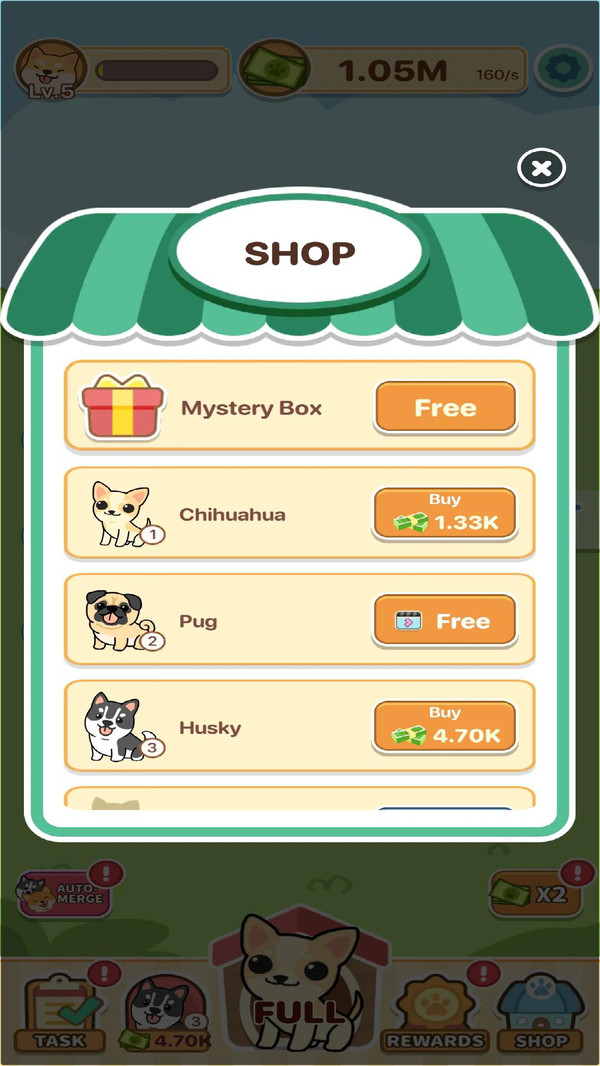 2、放置点击的方式,只要将一样的小狗合成就可以,并且消耗一定的金币材料;