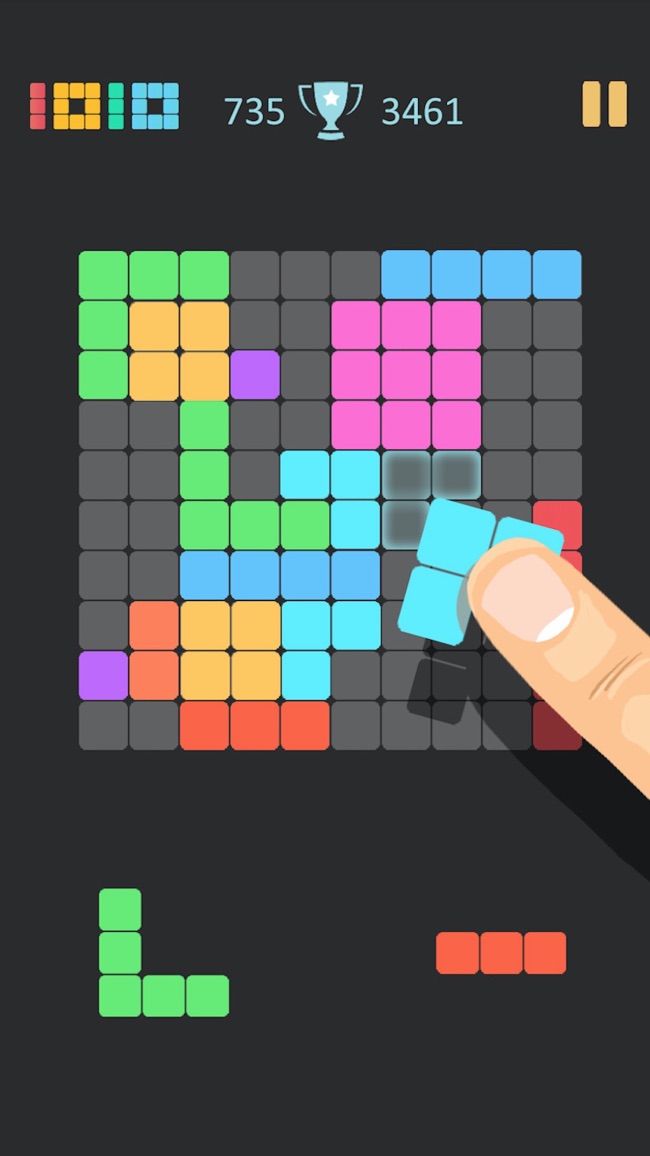 这是一个有趣的消除小游戏,引人入胜,简单而有特色的玩法让你感觉真的很酷。没有时间限制,不用区分颜色,只需要移动方块,看谁放的多,看谁消的多。通过拖放方块到屏幕上进行排列,当屏幕上横竖任何一个方向的格子被连起来后会消除,同时会得到更高的分数奖励。注意不要让格子占满10x10屏幕,那样您就无法继续放格子,游戏会结束。