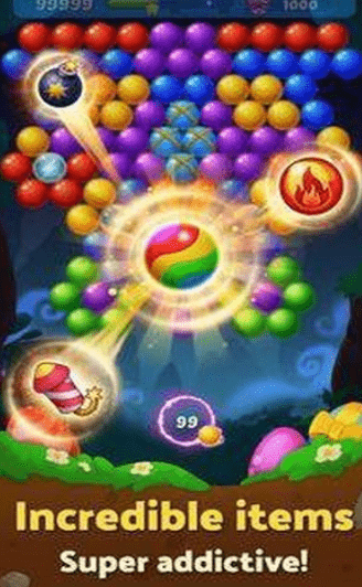 2、可以解锁各种特殊的泡泡,消除所有相同泡泡即可触发,分数越高获得的奖励越多;