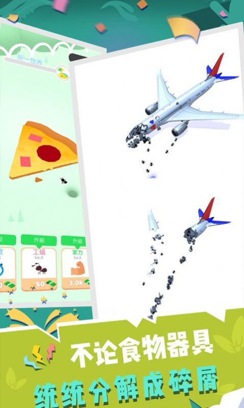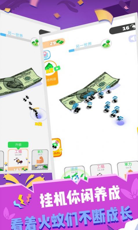 1、游戏画风非常可爱,开局一只小蚂蚁养成,组建解锁更多蚂蚁;