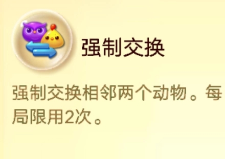 强制交换相邻的两个动物,每局限用2次,用过2次后当局不能继续使用 。