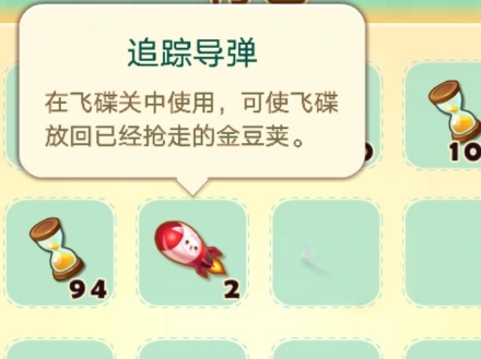 与飞碟同时出现,是为数不多的有利障碍。每个火箭都有自己的颜色,当与相同颜色的小动物连在一起三消时可以消除这个火箭。消除后,火箭可消除火箭上方的动物或障碍,并打晕外星飞碟,三步之内金豆荚不会往上移动。(仅限飞碟关卡)