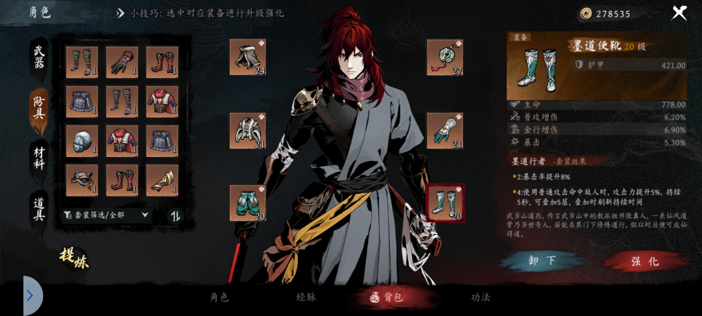 4件套,用的“墨道行者”——固定加暴击8%;普攻加攻击力5%,持续5s,可叠5层。