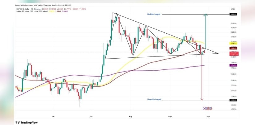 图表显示XRP日线形成对称三角形。分析师认为突破3美元或将开启上涨动能,目标区间3.60-4美元。