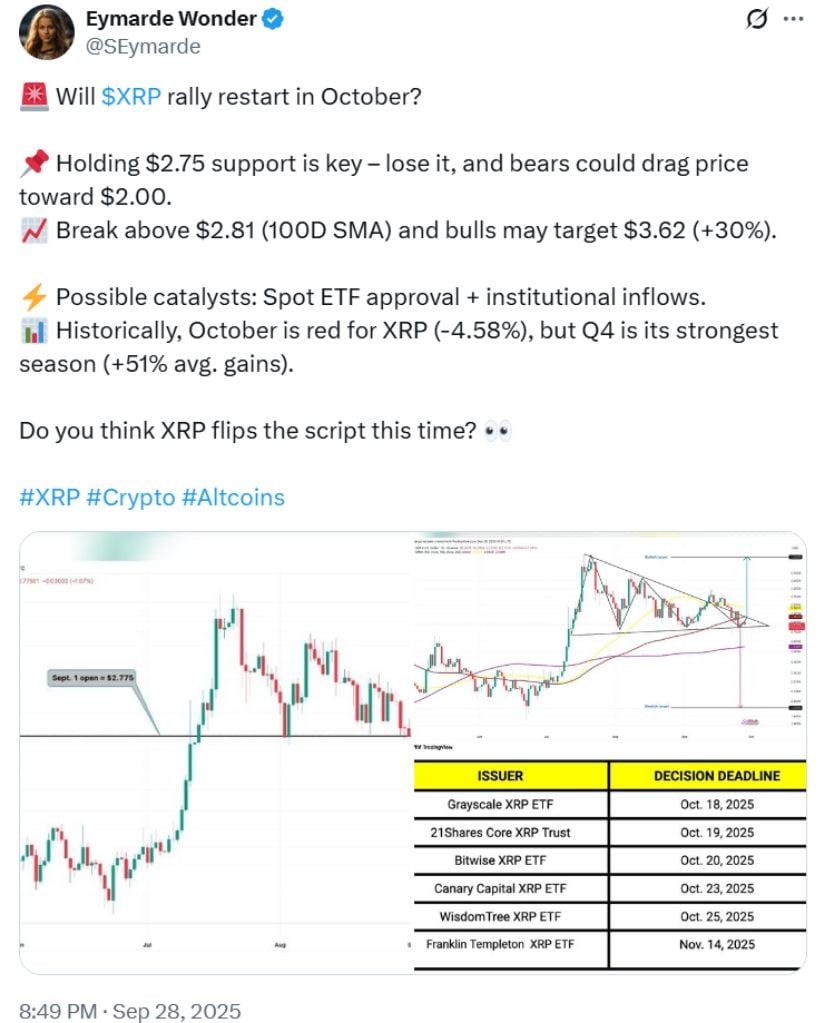 XRP十月走势取决于2.75美元支撑与2.81美元阻力,ETF预期与资金流入或扭转其季节性颓势。来源:@SEymarde via X