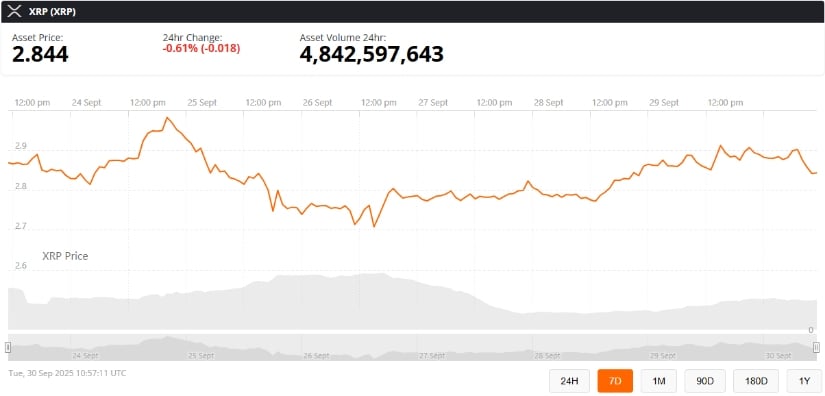 截至发稿,XRP报2.84美元,24小时下跌0.61%。来源:Brave New Coin XRP价格