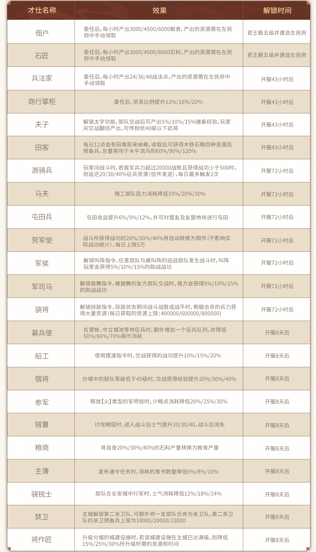 Zuominfu建造后,早期只选出了一名才华横溢的官员。第二名人才官员在Zuominfu的第5级开业,第三名人才官员在Zuominfu的第10级开业。