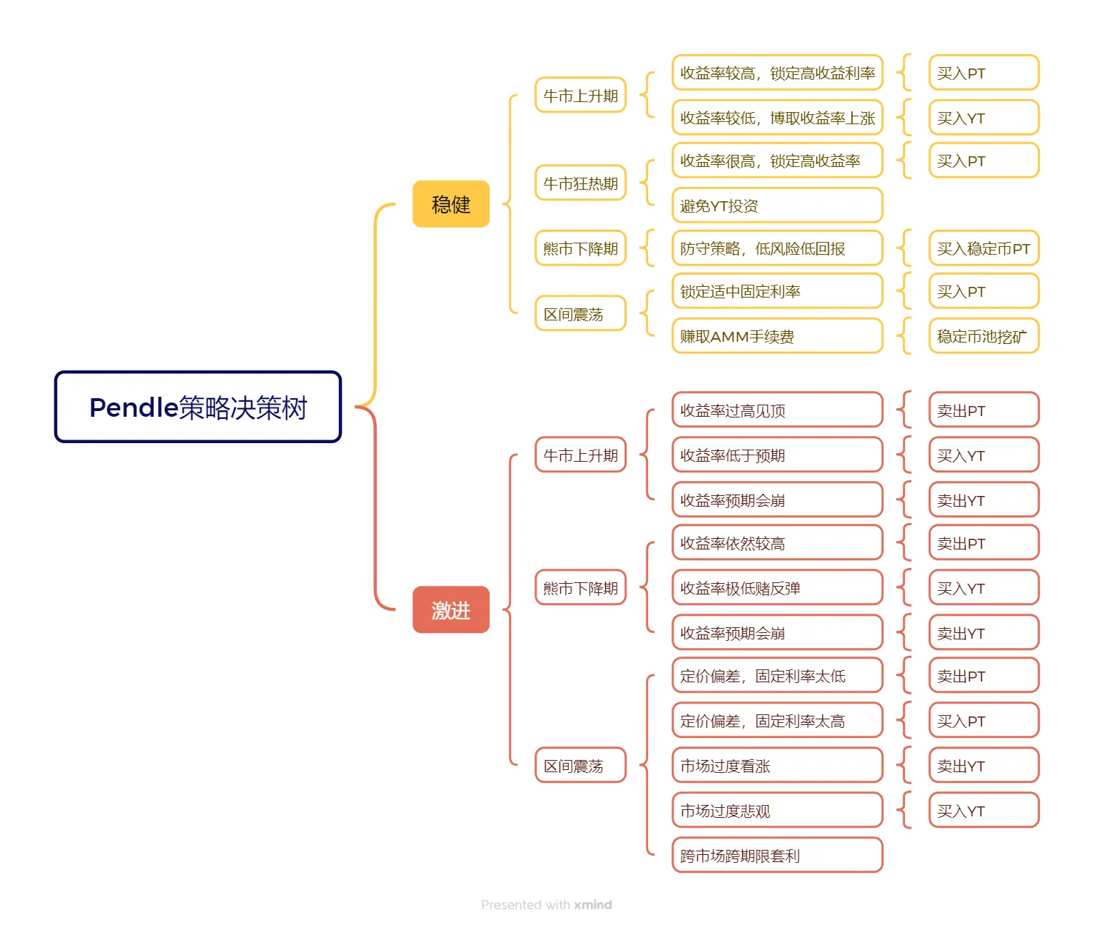当然,以上策略总体以稳健收益为主,核心逻辑是在不同市场週期下通过 买入 PT、买入 YT 或参与稳定币池挖矿 来实现风险与收益的平衡。对于风险偏好较高的激进型投资者,也可以选择更具进攻性的 卖出 PT 或 YT 策略,用于押注利率走势或博弈市场错配。此类操作对专业判断和执行力要求更高,风险仓位也更大,因此本文不做过多延展,仅供参考,具体可见下方决策树。