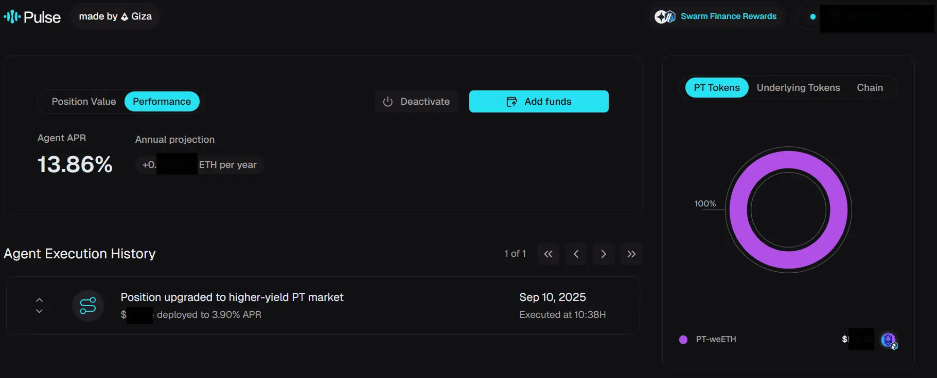 Agent 启用与资金管理:使用者可在官方网站(www.usepulse.xyz)一键启动 Pulse Agent,流程包括连线钱包、网路认证、白名单验证,并存入最低 0.13 ETH(约 $500)。完成启用后,资金即自动部署至最优 PT 市场并进入持续优化迴圈。使用者可随时追加资金,系统会自动再平衡与重新分配,后续存入不设最低门槛,大额资金则可提升组合多样化与优化效果。