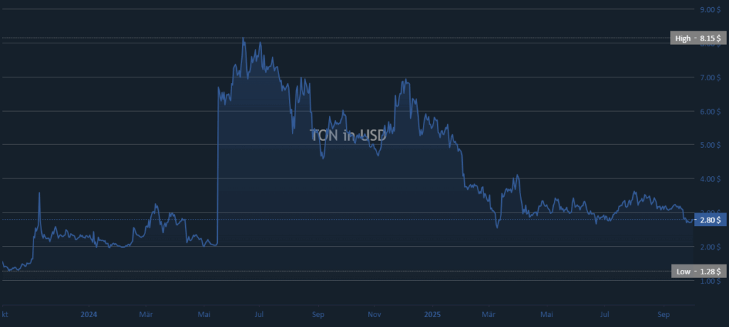 波动贯穿2024年末,TON数次冲高后均遭遇陡峭下跌。进入2025年,代币以递减速率探底,最低触及1.28美元后,当前交投于2.80美元附近。