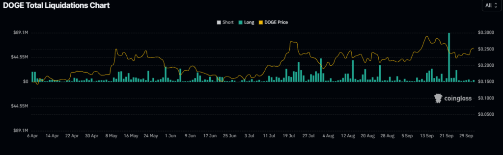 DOGE价格期间在0.15至0.30美元区间震荡。虽然空头清算时有发生,但多单清算频次更高、规模更大。这种失衡表明看涨押注虽占主导,却常败于市场波动。