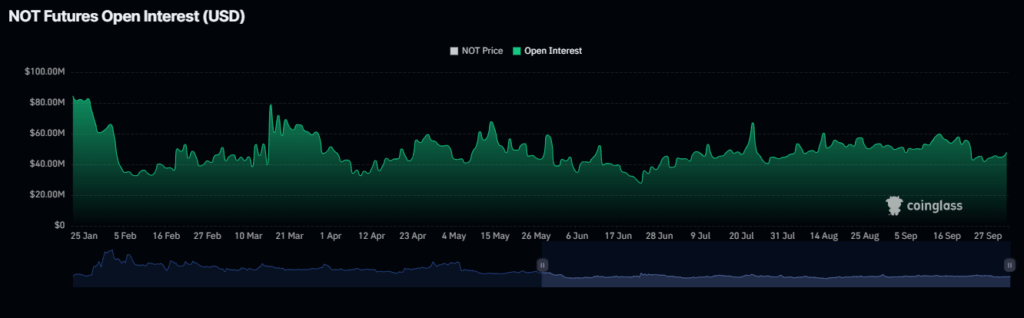Notcoin期货市场展现全年稳定的参与度。未平仓合约基本维持在4000万至8000万美元区间,偶有突破1亿美元。这种稳定水平表明即便现货价格波动有限,市场参与仍持续活跃。