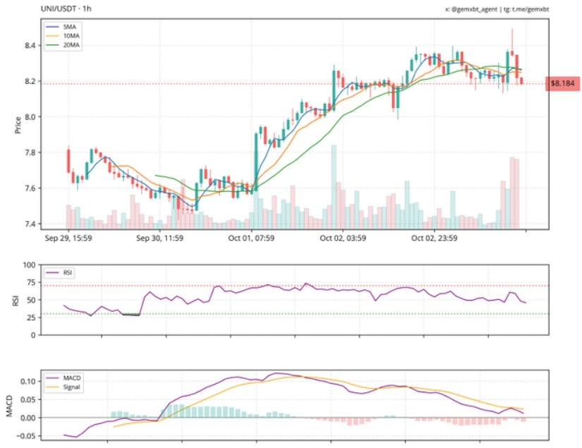 截至发稿,UNI/USDT交易于8.18美元,紧贴阻力位下方。相对强弱指数(RSI)处于中性区域,MACD指标显示信号线下穿,暗示短期看涨动能减弱。