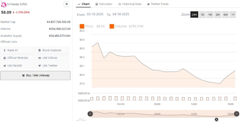BraveNewCoin数据显示,Uniswap现报8.09美元,24小时跌幅2.75%。其市值达48.5亿美元,日交易量3.049亿美元,流通供应量6.0048亿枚。