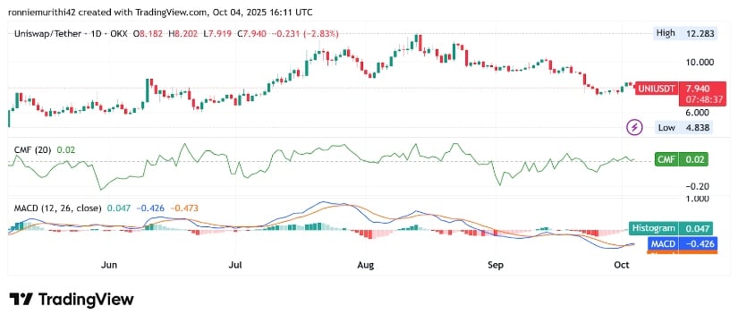 市场结构显示,自九月末低点以来,UNI持续形成更高的低点,表明底层需求仍在。但8.20美元附近阻力仍是关键转折点:有效突破将打开8.50-8.70美元上行空间,若遇阻则可能回落至7.40-7.50美元需求区。