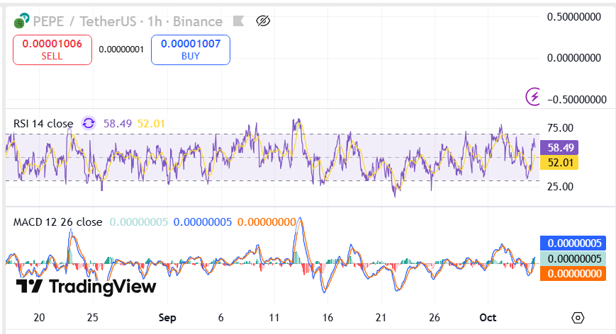 佩佩币现报0.00001012美元,正测试0.00001016美元阻力位,RSI接近62且MACD保持平稳,突破信号正在形成。