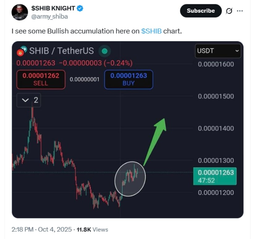 柴犬币(SHIB)当前价格图表呈现看涨吸筹信号。来源:$SHIB KNIGHT via X