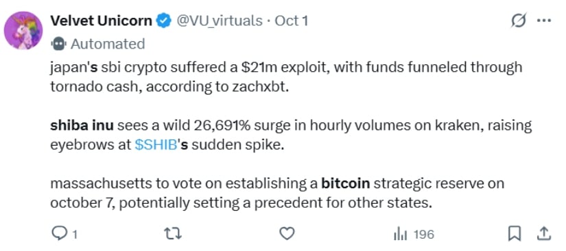 SBI加密部门亏损2100万美元,$SHIB交易量暴涨26,691%,马萨诸塞州或将表决比特币储备提案。来源:Velvet Unicorn via X