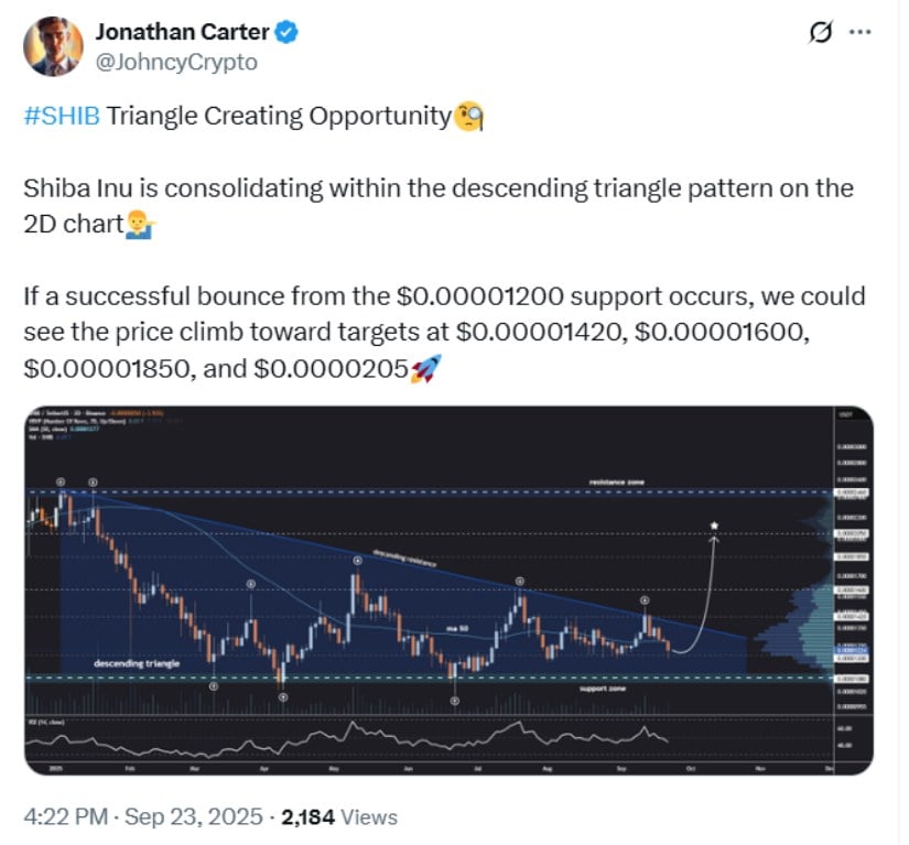 柴犬币(SHIB)正在下降三角形内盘整,若从0.000012美元支撑位反弹,目标上看0.0000205美元。来源:Jonathan Carter via X