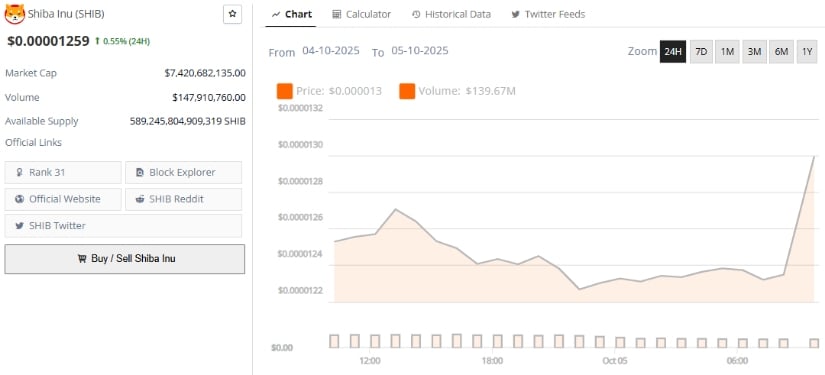 截至发稿,柴犬币交易价约0.00001259美元,24小时上涨0.55%。来源:Brave New Coin