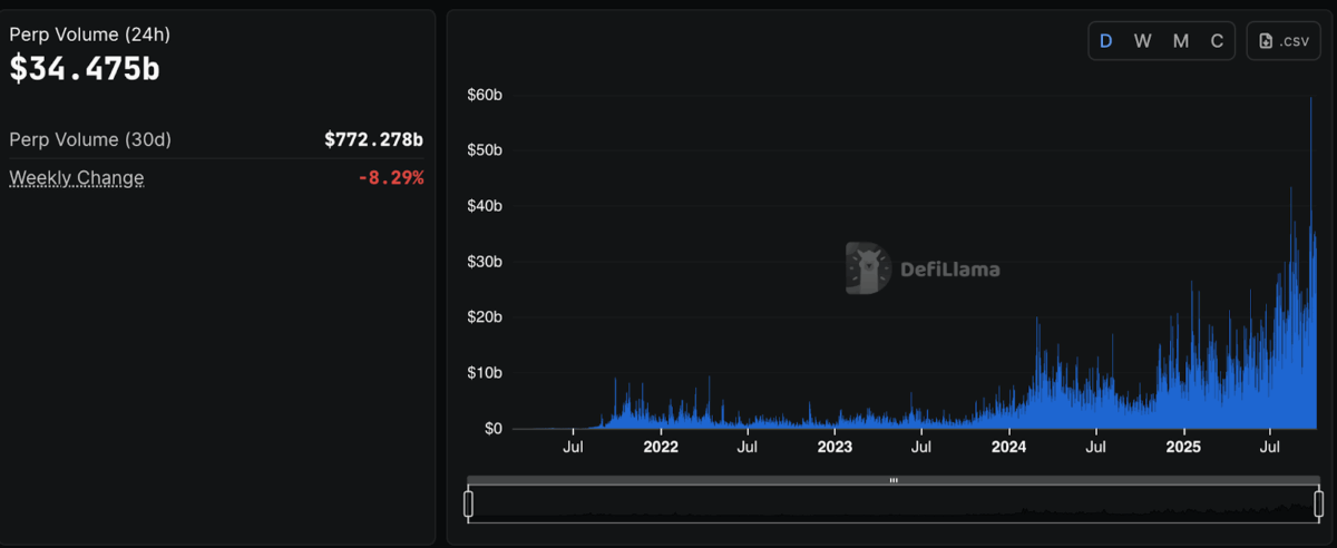 DeFiLlama数据显示永续合约交易量激增,24小时内成交额达344.75亿美元。过去30日累计成交量达7722.8亿美元,但周环比下降8.29%,暗示市场热情短期回调。
