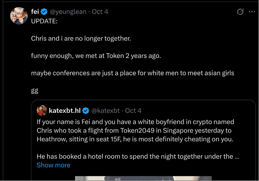 更戏剧性的是,Chris 的女友 Fei (@yeunglean) 当天就看到了这条贴文。同天,她发布分手声明:「更新:Chris 和我刚分手了。有趣的是,我们两年前在 Token 第一次认识;也许产业会议只是白男认识亚洲女孩的地方。gg(游戏结束)。」