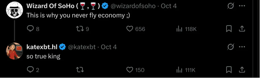 Wizard Of SoHo 调侃道:「这就是为什么你永远不要坐经济舱 ;)」Kate 回应:「说得对,大佬。」