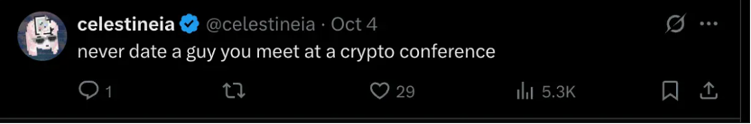 用户 celestineia 给出了直白的建议:「永远不要和在加密会议上遇到的男人约会。」