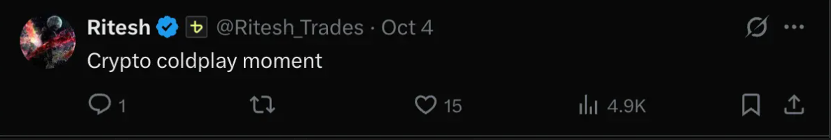 Ritesh (@Ritesh_Trades) 评价:「加密圈里的 Coldplay 时刻。」