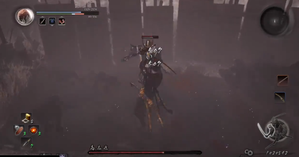 当其血量降至约40%,会后跳召唤灵兽「唐狮子」并进入常世状态。召唤时周围有落雷,贸然上前会遭雷击减速,因此建议暂缓进攻。常世状态下,他的长枪附有雷光,且全程霸体,无法打断,攻击也更猛烈、范围更大。此时应转为保守打法,维持中距离周旋,重点回避强化后的右前枪挑与「大天升」,躲避方式与之前相同。仅在他出完大硬直招式(如砸地)后,用「枪压」或「五月雨突刺」偷刀1-2下,继续削精。该阶段以磨尽其精力为核心,一旦清空,他就会跪地喘气并退出常世状态,此时上前处决即可获胜。