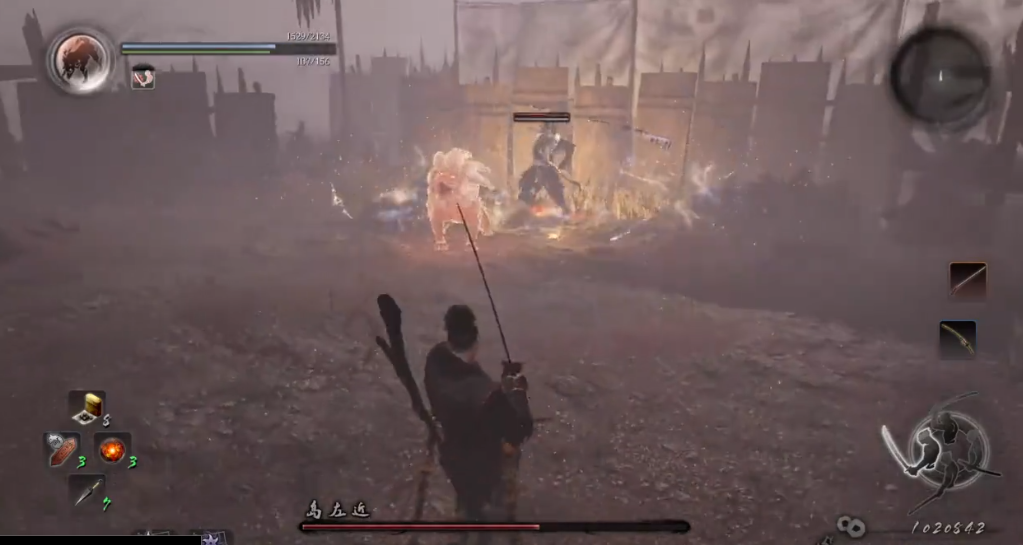 中距离下,他常使用快速突刺,可防御抵挡但需注意精力管理,避免被打空。他有时会突然向前翻滚近身,此时需高度警惕——翻滚后可能接低头躬身投技,或举枪施展「大天升」竖劈。见到低头动作应迅速向两侧闪避躲投技,若见他举枪则立即向后闪避避开劈斩。若反应不及,可在他刚开始翻滚时就提前后撤,以确保安全。近身时,他惯用平A连击,收招常以名为「封动」的横扫结束。切忌在他连招刚停或「封动」未完全收招时贸然进攻,务必等待其动作彻底结束、长枪回摆后再以「枪压」反击。