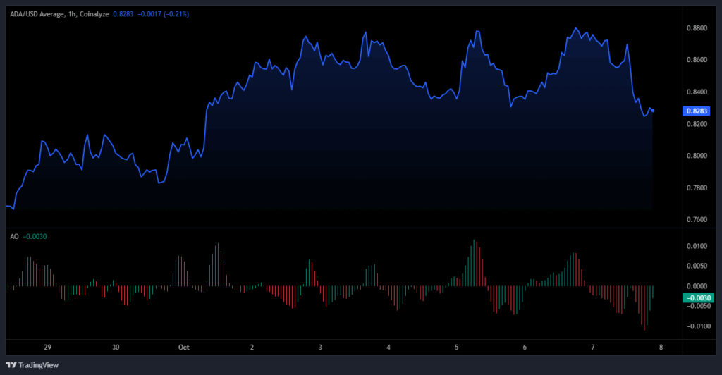 卡尔达诺的ADA仍保持高度韧性,价格在近期上涨后稳定在0.82至0.83美元区间。该代币此前通过0.75至0.88美元的上升通道实现上涨,显示出稳健的筑底态势。但当前Awesome Oscillator(AO)指标走平,暗示可能出现短期盘整。