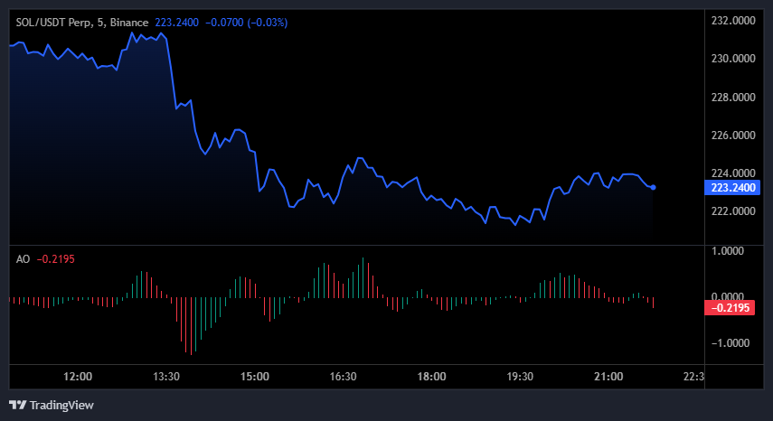 Solana的SOL在低时间框架持续承压后,从228美元回调至223美元。AO指标维持在零轴下方反映看跌情绪延续。但柱状图红色柱体逐渐缩短,表明随着波动率收缩,卖出节奏正在放缓。