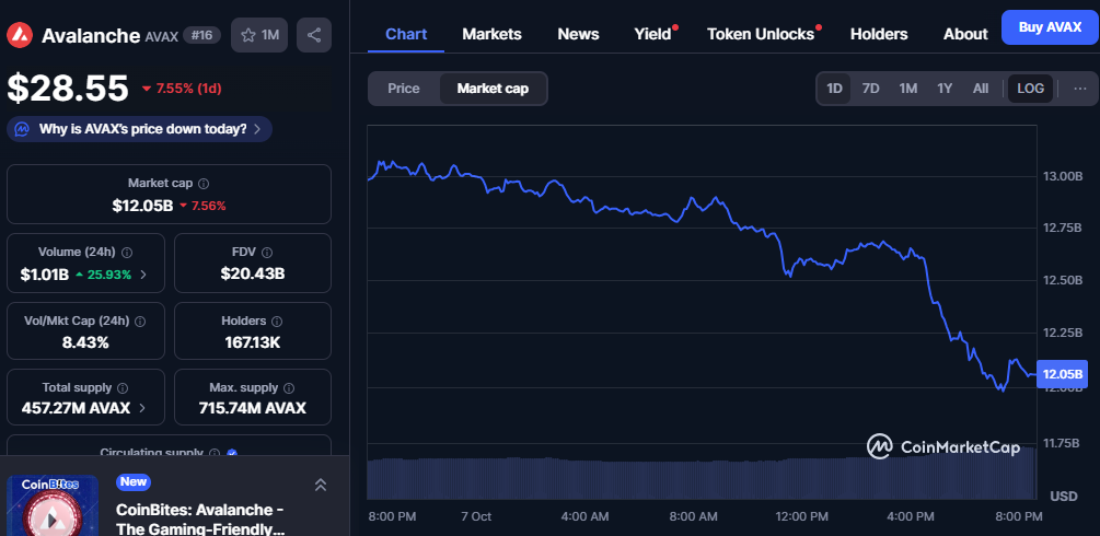 雪崩协议(AVAX)领跌7.55%,交易时段内抛压加剧使其价格跌至28.55美元附近。其市值缩水至120.5亿美元,而24小时交易量逆势增长25.93%达到10.1亿美元。交易活跃度提升显示市场参与度增强,8.43%的成交量市值比表明即便下跌趋势中仍保持强劲流动性。